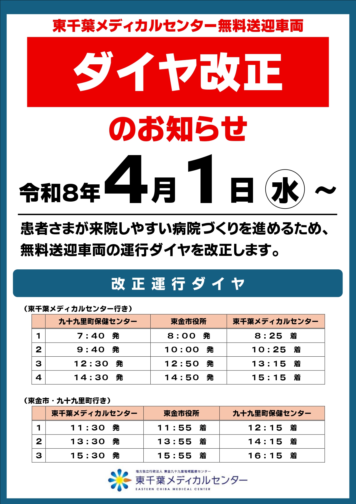 無料送迎車両ダイヤ改正のお知らせ 2025/12/25 重要なお知らせ 患者さまが来院しやすい病院づくりを進めるため、令和8年4月1日(水)より無料送迎車両の運行ダイヤを改正します。なお、令和8年3月31日(火)までは現行のダイヤで運行しますので、お間違えにご注意ください。 無料送迎車両の詳細につきましては、下記のページをご確認ください。 交通アクセス 次の記事へ 一覧へ戻る 前の記事へ お知らせ すべて 新型コロナウイルス関連 (28) 重要なお知らせ (12) 病院からのお知らせ (132) 看護部NEWS (27) イベント (29) 採用情報 (16) 更新情報 (67) 地域医療連携室 (24)